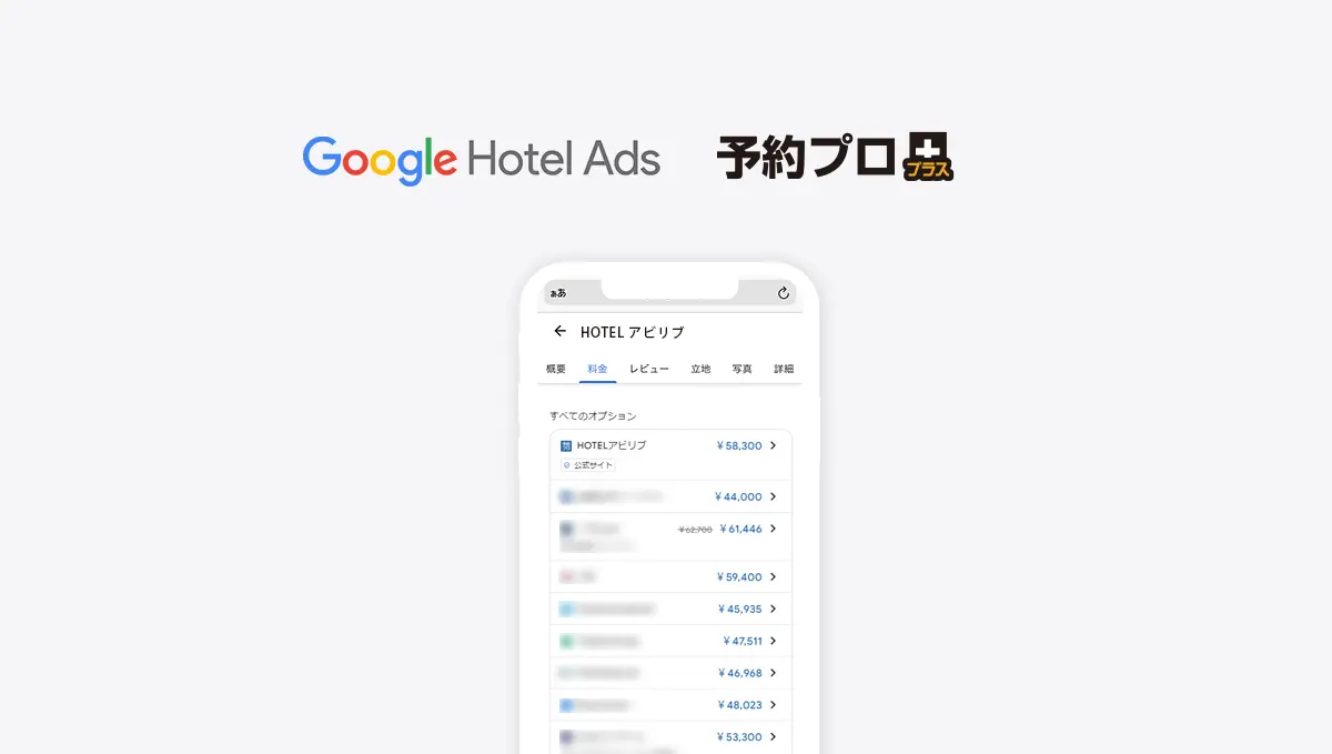連携手続き後よりGoogleホテル検索上に予約プロプラスの部屋在庫や料金情報が反映されます。※「Googleホテル検索連携機能」は別途お申し込みが必要です。