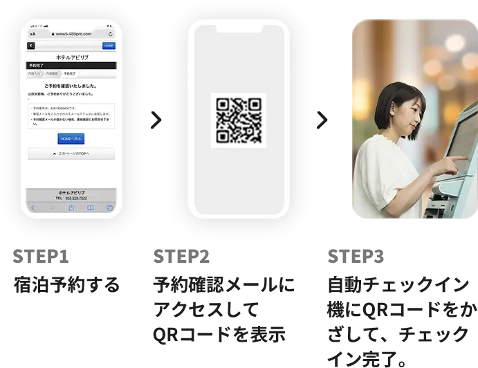 PMSに接続されている自動チェックイン機でQRコードを読み込み、予約情報を照合するイメージです。 -